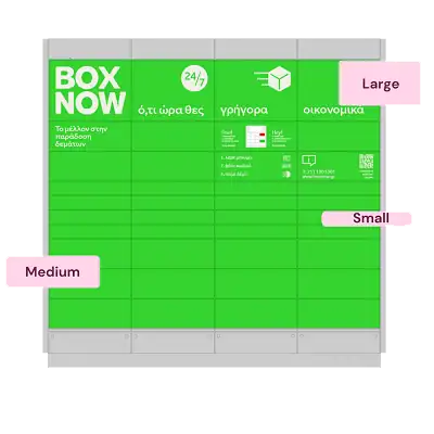 Tα BOX NOW locker διαθέτουν τρία διαφορετικά μεγέθη θυρίδων με μέγιστο βάρος τα 20kg: Mικρή (Υ: 8 cm, Β: 45 cm, Μ: 60 cm), Μεσαία (Υ: 17 cm, Β: 45 cm, Μ: 60 cm), Μεγάλη (Υ: 36 cm, Β: 45 cm, Μ: 60 cm)