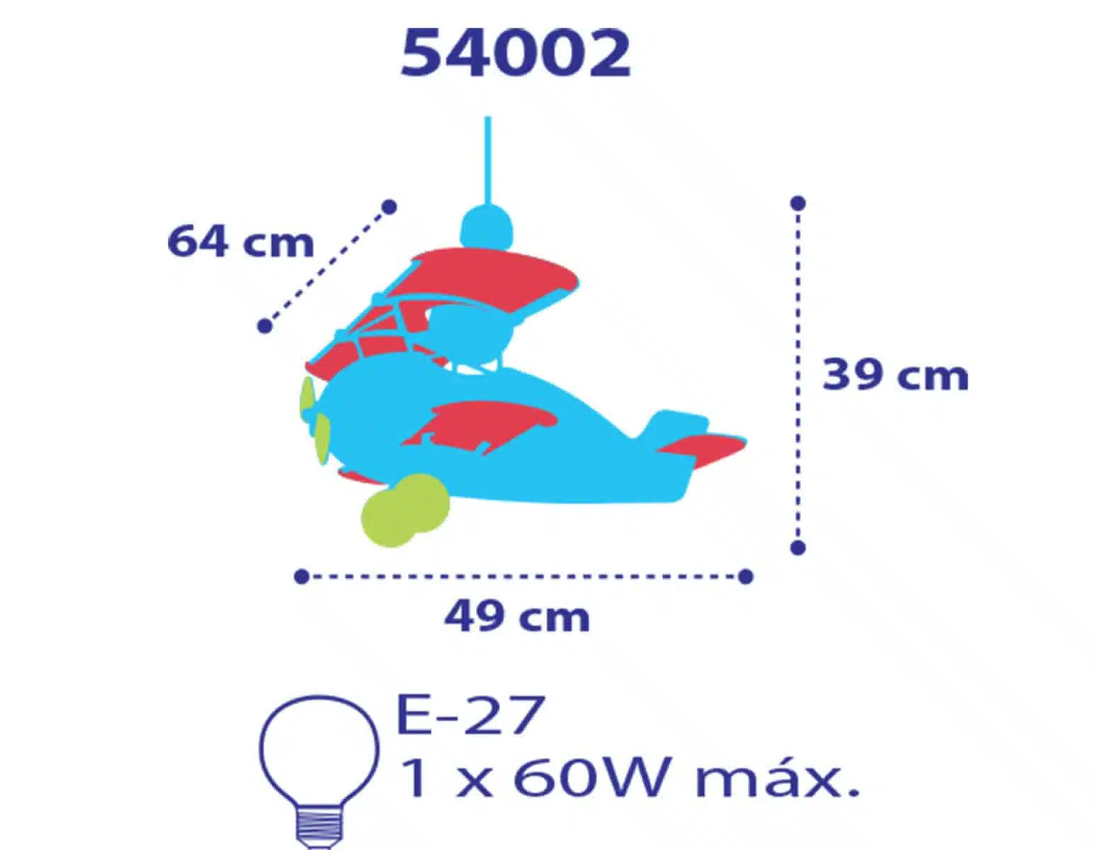 Κρεμαστό παιδικό φωτιστικό οροφής κατάλληλο για γενικό φωτισμό σε σχήμα αεροπλάνου. Συνθετικό υλικό αντοχής από πολυπροπυλένιο, συνθετικά, πλαστικά μέρη και hardboard. Σώμα από hardboard σε λεπτό πάχος, που δεν περιορίζει τη φωτεινότητα. Απαιτείτε συναρμολόγηση από ενήλικα. Τύπος ντουί E27 με θέση για ένα μεγάλο τύπου λαμπτήρα. Κατασκευάζετε εξ ολοκλήρου στην Ευρώπη. Διαστάσεις σε εκατοστά: Μ:77 Χ Π:50 Χ Ύ:40. Το Baby Planes αεροπλάνο φωτιστικό οροφής γαλάζιο συμπληρώνει τα υπόλοιπα παιδικά φωτιστικά της συλλογής.