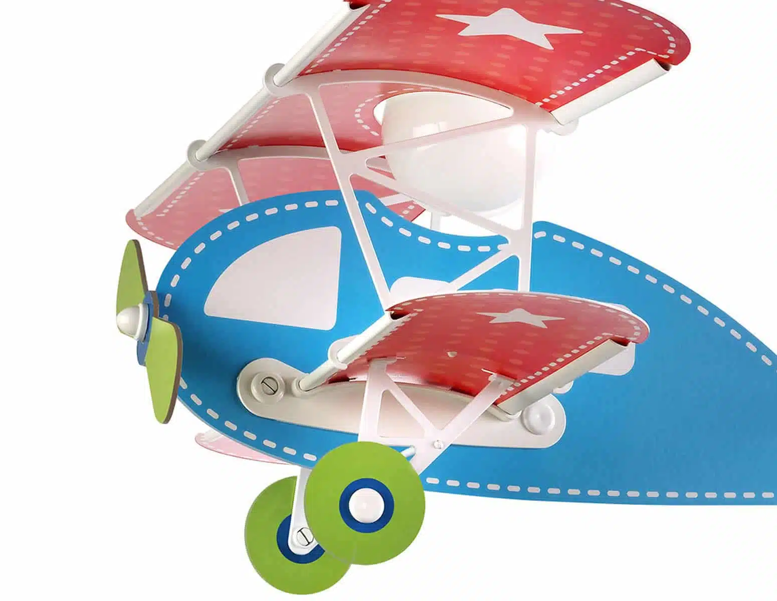 Παιδικό φωτιστικό οροφής κατάλληλο για παιδιά και σχεδιασμένο για γενικό φωτισμό. Αφήστε τη φαντασία των μικρών σας πιλότων να “πετάξει” με αυτό το μεγάλο σε διάσταση φωτιστικό σε σχήμα αεροπλάνου. Φτιαγμένο από πολυπροπυλένιο και hardboard, χωρίς να “κόβει” καθόλου την φωτεινότητα δίνει χαρά και άπλετο φως. Παρέχει ομοιόμορφο φωτισμό δημιουργώντας περιβάλλον που ενθαρρύνει τα παιδιά να επιδοθούν σε ότι τους αρέσει περισσότερο. Διασκέδαση και δημιουργικότητα μαζί με ασφάλεια και οικονομία. Το Baby Planes γαλάζιο φωτιστικό οροφής συμπληρώνει τα υπόλοιπα παιδικά φωτιστικά της συλλογής.