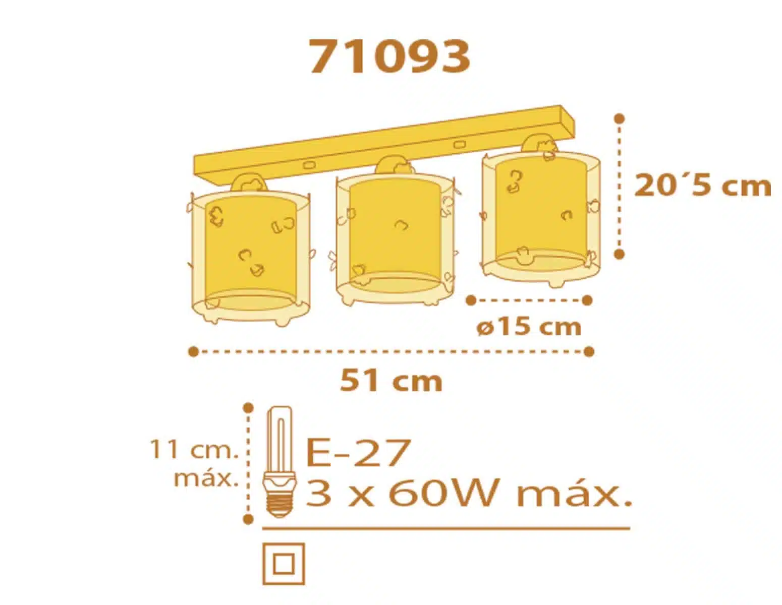 Τρίφωτο παιδικό φωτιστικό οροφής για άπλετο γενικό φωτισμό. Φωτιστικά σώματα διπλού τοιχώματος. Πλαστικά, μεταλλικά μέρη & τοίχωμα πολυπροπυλενίου. Κιτ ανάρτησης σε ράγα με μεταλλική βάση στήριξης. Τύπος ντουί: 3 Χ E27 με θέσεις για τρεις λαμπτήρες. Διαστάσεις εκατοστά: Υ:20,5 – Μ:51. Κατασκευασμένο εξ ολοκλήρου στην Ευρώπη. Το Bee Happy τρίφωτο φωτιστικό οροφής συμπληρώνει την υπόλοιπη συλλογή παιδικών φωτιστικών της σειράς.