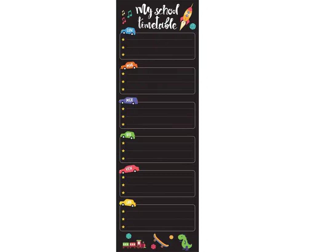 Μοντέρνος μαυροπίνακας σχεδιασμένος για τις σύγχρονες ανάγκες ενός παιδιού, κατασκευασμένος από βινύλιο. Το παιδί μπορεί να σημειώνει το πρόγραμμα του σχολείου ή των αγγλικών, την συμμετοχή του σε δραστηριότητες ή ραντεβού με φίλους και φίλες. Είναι αυτοκόλλητος και τοποθετείτε εύκολα και γρήγορα σε κάθε λεία επιφάνεια ή τον τοίχο. Η γραφή γίνετε είτε με την κλασική κιμωλία είτε με σύγχρονο λευκό μαρκαδόρο πίνακα.