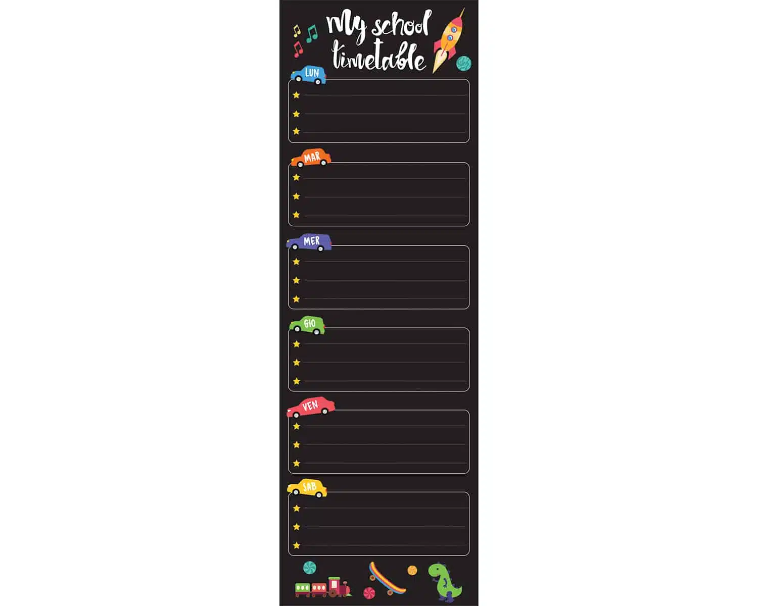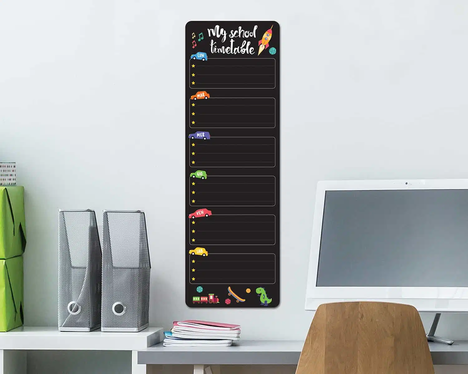 Μοντέρνος μαυροπίνακας σχεδιασμένος για τις σύγχρονες ανάγκες ενός παιδιού, κατασκευασμένος από βινύλιο. Το παιδί μπορεί να σημειώνει το πρόγραμμα του σχολείου ή των αγγλικών, την συμμετοχή του σε δραστηριότητες ή ραντεβού με φίλους και φίλες. Είναι αυτοκόλλητος και τοποθετείτε εύκολα και γρήγορα σε κάθε λεία επιφάνεια ή τον τοίχο. Η γραφή γίνετε είτε με την κλασική κιμωλία είτε με σύγχρονο λευκό μαρκαδόρο πίνακα.