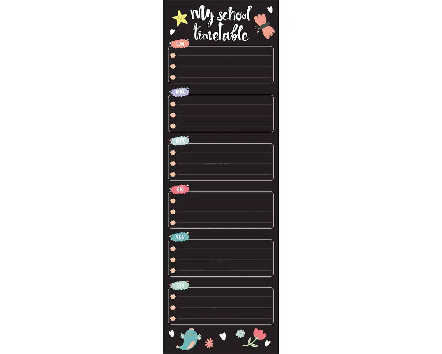 Μοντέρνος μαυροπίνακας σχεδιασμένος για τις σύγχρονες ανάγκες ενός παιδιού, κατασκευασμένος από βινύλιο. Το παιδί μπορεί να σημειώνει το πρόγραμμα του σχολείου ή των αγγλικών, την συμμετοχή του σε δραστηριότητες ή ραντεβού με φίλους και φίλες. Είναι αυτοκόλλητος και τοποθετείτε εύκολα και γρήγορα σε κάθε λεία επιφάνεια ή τον τοίχο. Η γραφή γίνετε είτε με την κλασική κιμωλία είτε με σύγχρονο λευκό μαρκαδόρο πίνακα.
