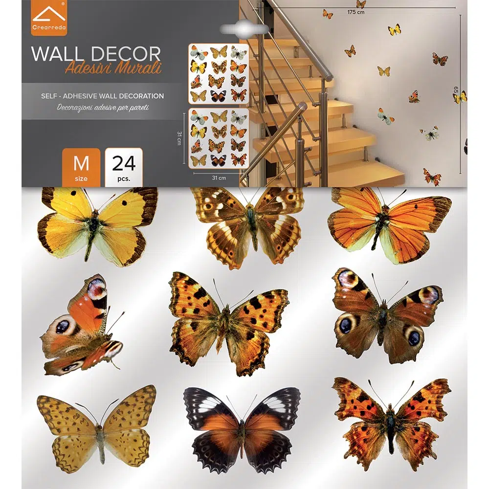Διακοσμητικά τοίχου, που το προσαρμόζονται στους τοίχους, τις πόρτες εύκολα και γρήγορα διακοσμώντας σε ελάχιστο χρόνο αποτελεσματικά και οικονομικά. Προσθέτουν ένα διασκεδαστικό χαρακτήρα και χρώμα. Είναι αυτοκόλλητα και τοποθετούνται εύκολα δίδοντας μια προσωπική “πινελιά” στο κάθε δωμάτιο. Τα Butterflies αυτοκόλλητα τοίχου βινυλίου επανατοποθετούνται χωρίς ζημιές και έρχονται σε καρτέλα, κομμένα και έτοιμα για χρήση.