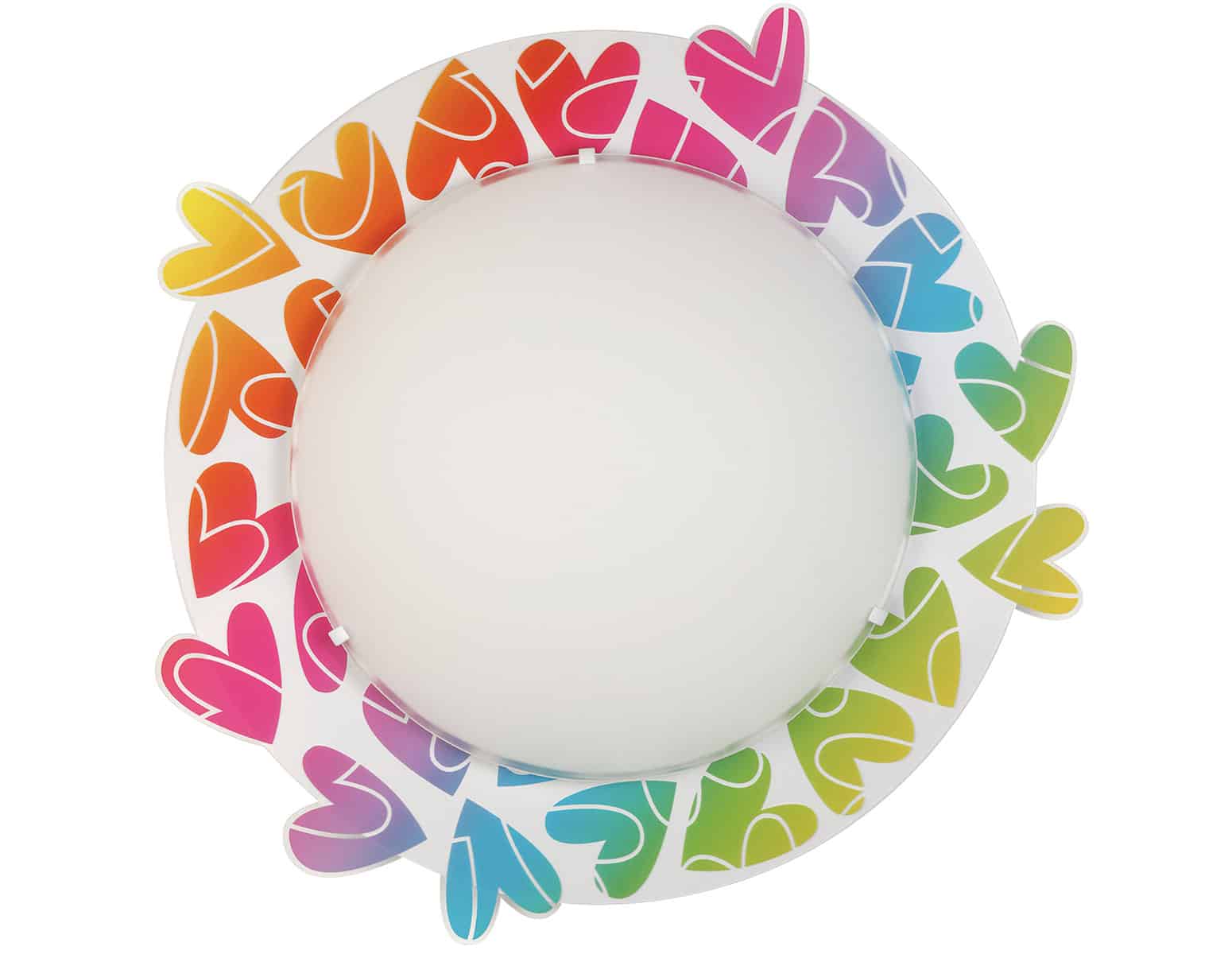 Μοντέρνο μεγάλο σε μέγεθος εφηβικό φωτιστικό οροφής πλαφονιέρα ή απλίκα τοίχου κατάλληλο για εφήβους και σχεδιασμένο για γενικό φωτισμό. Προσθέτει διασκεδαστικό χαρακτήρα και χρώμα σε κάθε δωμάτιο παρέχοντας ομοιόμορφο και άπλετο φωτισμό. Δημιουργεί περιβάλλον κατάλληλο για όλες τις δραστηριότητες: διασκέδαση ή δημιουργία. Το Cuore πλαφονιέρα ή απλίκα τοίχου συμπληρώνει τα υπόλοιπα φωτιστικά της συλλογής.