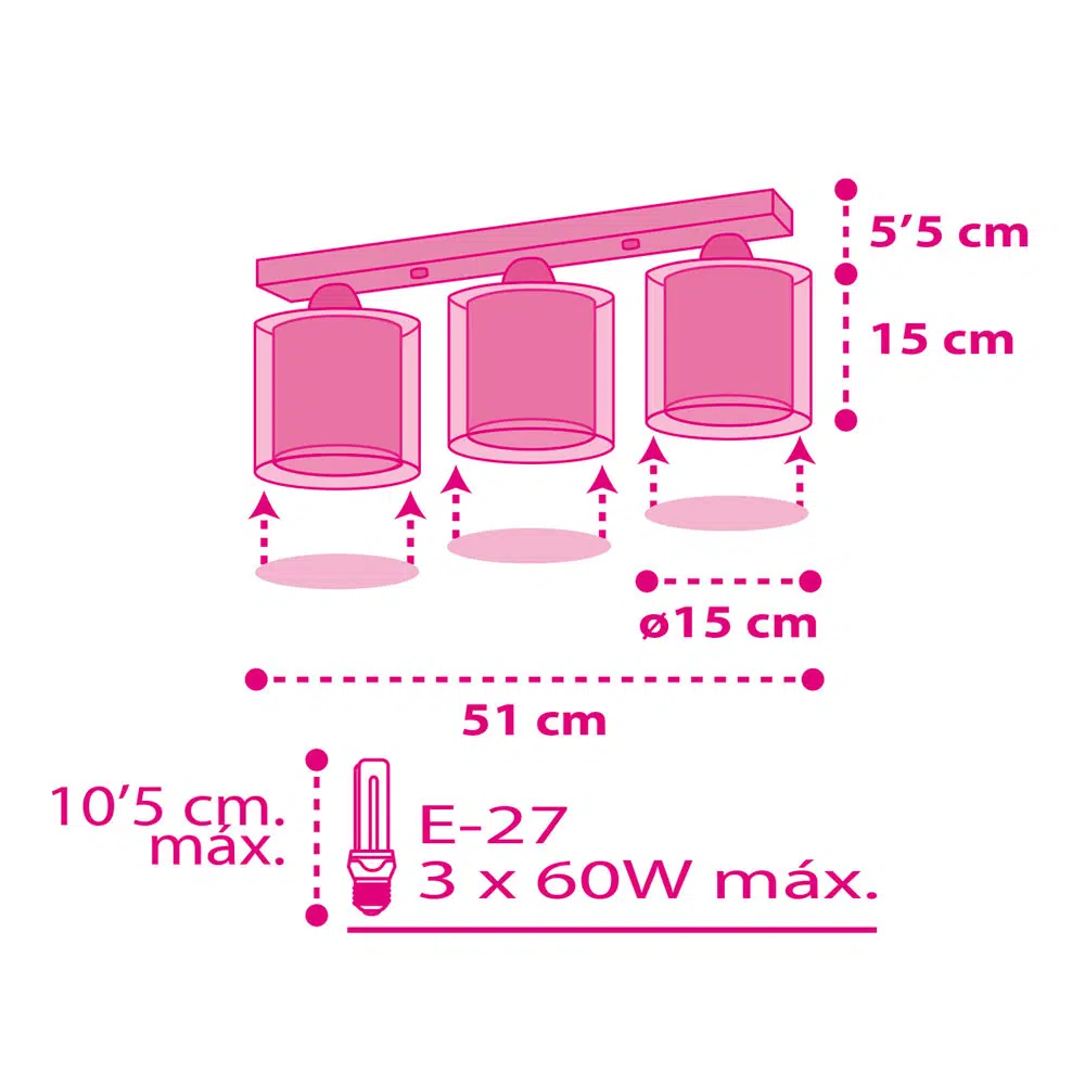 Μοντέρνο φωτιστικό οροφής κατάλληλο για εφηβικά δωμάτια και σχεδιασμένο για γενικό φωτισμό. Είναι μοναδικό στο είδος του με τρία φωτιστικά σώματα, που φωτίζουν παρέχοντας άπλετο φως σε κάθε δωμάτιο. Προσθέτει διασκεδαστικό χαρακτήρα και χρώμα δημιουργώντας κατάλληλο περιβάλλον για όλες τις δραστηριότητες: διασκέδαση ή δημιουργία. Το Cuore τρίφωτο φωτιστικό οροφής συμπληρώνει τα υπόλοιπα φωτιστικά της συλλογής.