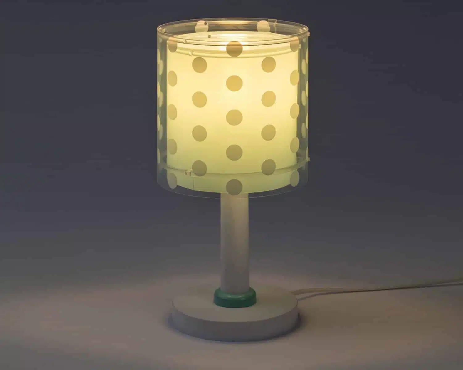 Κλασικής σχεδίασης παιδικό φωτιστικό κομοδίνου με διπλό τοίχωμα με διάφανο το εξωτερικό του. Συνθετικό υλικό αντοχής πολυπροπυλενίου. Ιδανικό για γραφείο ή κομοδίνο για διάβασμα ή συμπληρωματικό φωτισμό. Τύπος ντουί E14 με θέση για έναν λαμπτήρα LED και διακόπτη λειτουργίας επάνω στο καλώδιο. Το Dots Green κομοδίνου φωτιστικό συμπληρώνει τα υπόλοιπα παιδικά φωτιστικά της συλλογής και είναι κατασκευασμένο εξ ολοκλήρου στην Ευρώπη.