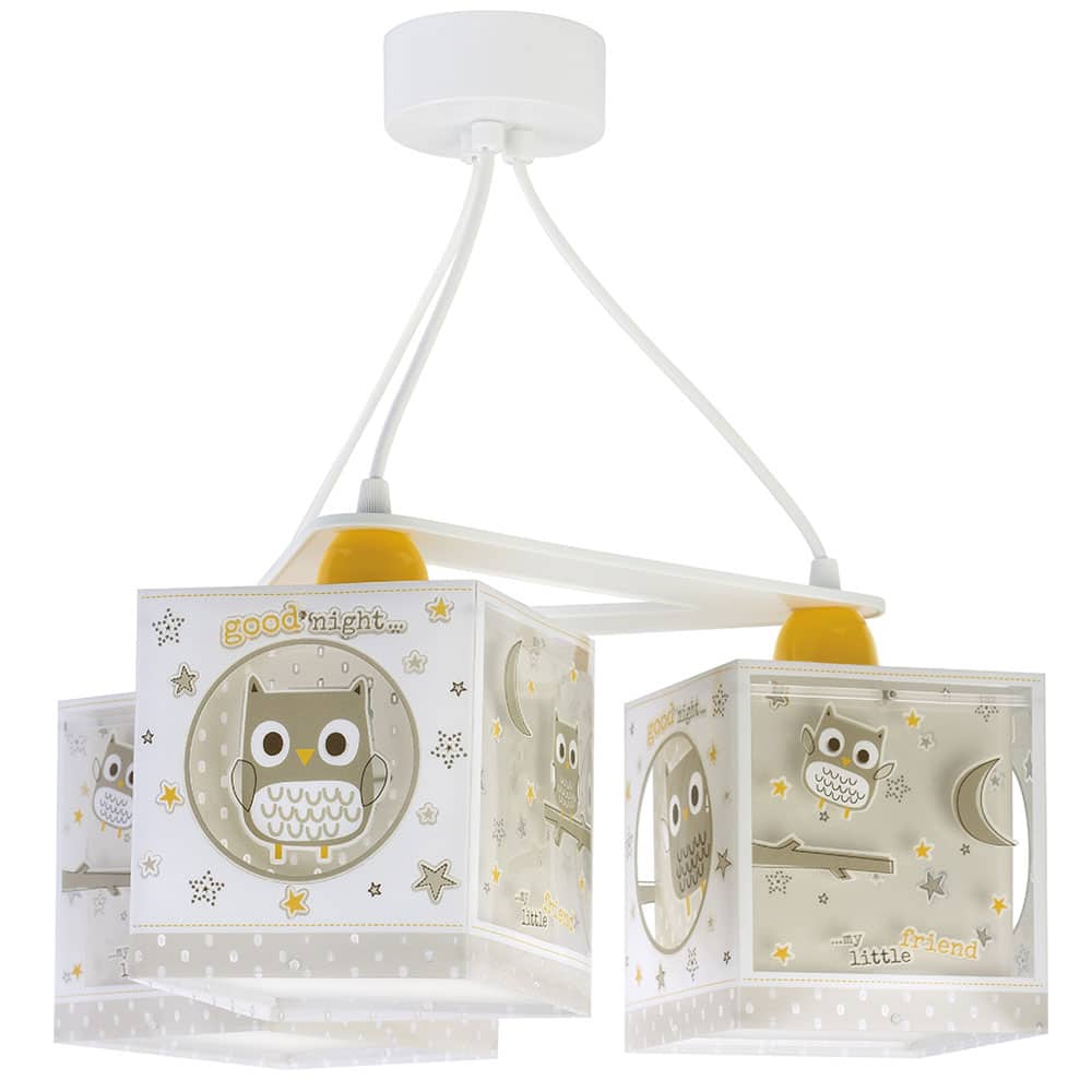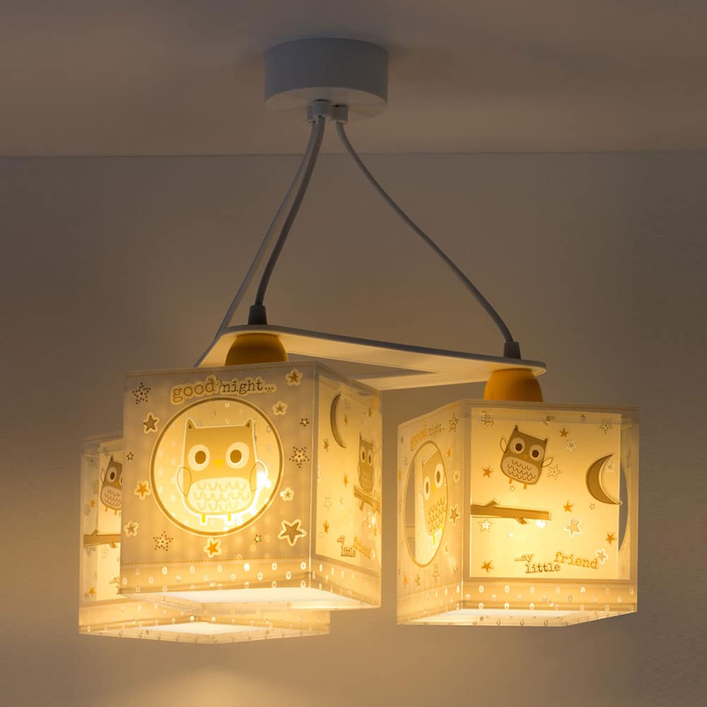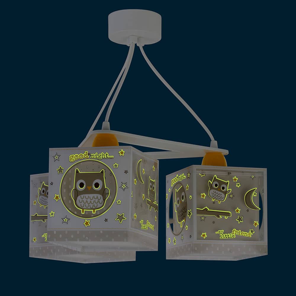 Μοντέρνα, τριγωνική κατασκευή με τρία φωτεινά σώματα σε κάθε γωνία και ανάλογες θέσεις λαμπτήρων. Το Good Night κρεμαστό τρίφωτο οροφής είναι κατασκευασμένο με διπλά τοιχώματα προσφέρει άπλετο φως, διασκεδαστικό χαρακτήρα και χρώμα σε κάθε σημείο του παιδικού δωματίου. Το εξωτερικό τοίχωμα των φωτιστικών σωμάτων έχουν φωσφορίζοντα στο σκοτάδι μέρη. Απόλυτα ασφαλές ώστε τα παιδιά να μπορούν να μελετήσουν, να παίξουν και να κοιμηθούν παρέα με το αγαπημένο τους θέμα. Το Good Night κρεμαστό τρίφωτο οροφής κατασκευάζεται εξ ολοκλήρου στην Ευρώπη και συμπληρώνει τα υπόλοιπα φωτιστικά της συλλογής.