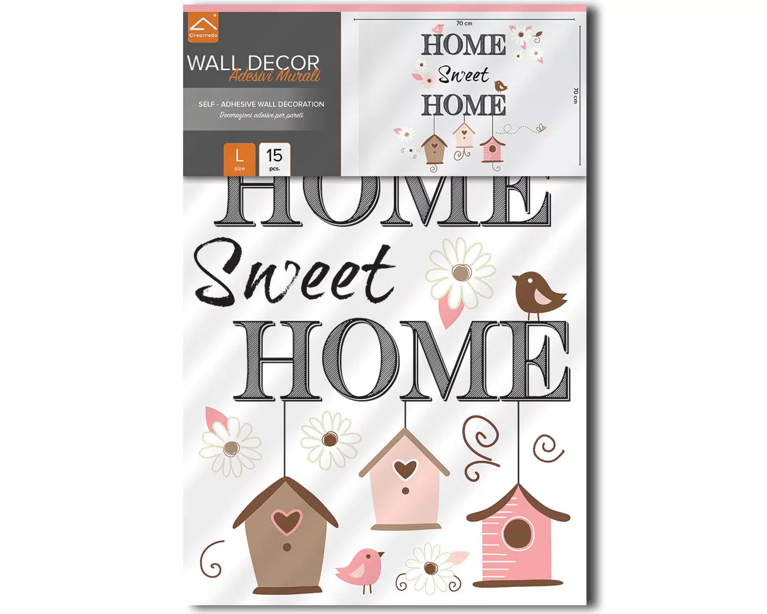 Διακοσμητικά τοίχου, που τοποθετούνται και προσαρμόζονται εύκολα και γρήγορα διακοσμώντας σε ελάχιστο χρόνο αποτελεσματικά και οικονομικά. Προσθέτουν ένα διασκεδαστικό χαρακτήρα και χρώμα. Είναι αυτοκόλλητα και τοποθετούνται εύκολα δίδοντας μια προσωπική “πινελιά” στο δωμάτιο. Τα Home Sweet Home αυτοκόλλητα τοίχου βινυλίου επανατοποθετούνται χωρίς ζημιές και έρχονται σε καρτέλα, κομμένα και έτοιμα για χρήση.