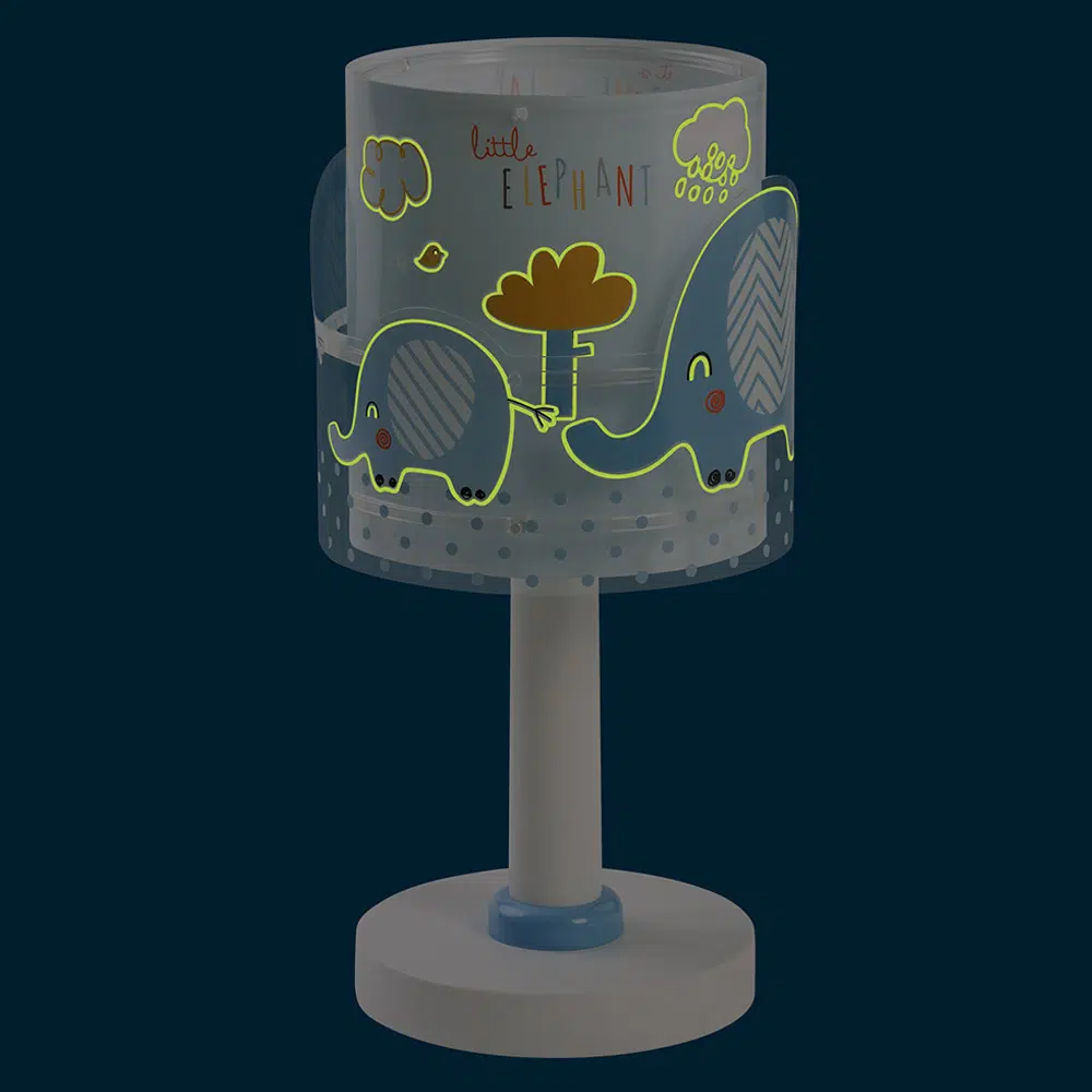 Little Elephant Blue κομοδίνου φωτιστικό κλασικής σχεδίασης παιδικό φωτιστικό κομοδίνου διπλού τοιχώματος για συμπληρωματικό φωτισμό. Διάφανο εξωτερικό τοίχωμα με μαγικά φωσφορίζοντα μέρη στο σκοτάδι. Συνθετικό υλικό αντοχής άκαυστου πολυπροπυλενίου. Ιδανικό για χρήση σε γραφείο ή κομοδίνο. Τύπος ντουί E14 με θέση για έναν λαμπτήρα LED και διακόπτη λειτουργίας επάνω στο καλώδιο. Το Little Elephant Blue κομοδίνου φωτιστικό είναι κατασκευασμένο εξ ολοκλήρου στην Ευρώπη, συμπληρώνει τα υπόλοιπα παιδικά φωτιστικά της συλλογής και είναι κατάλληλο και για διάβασμα.