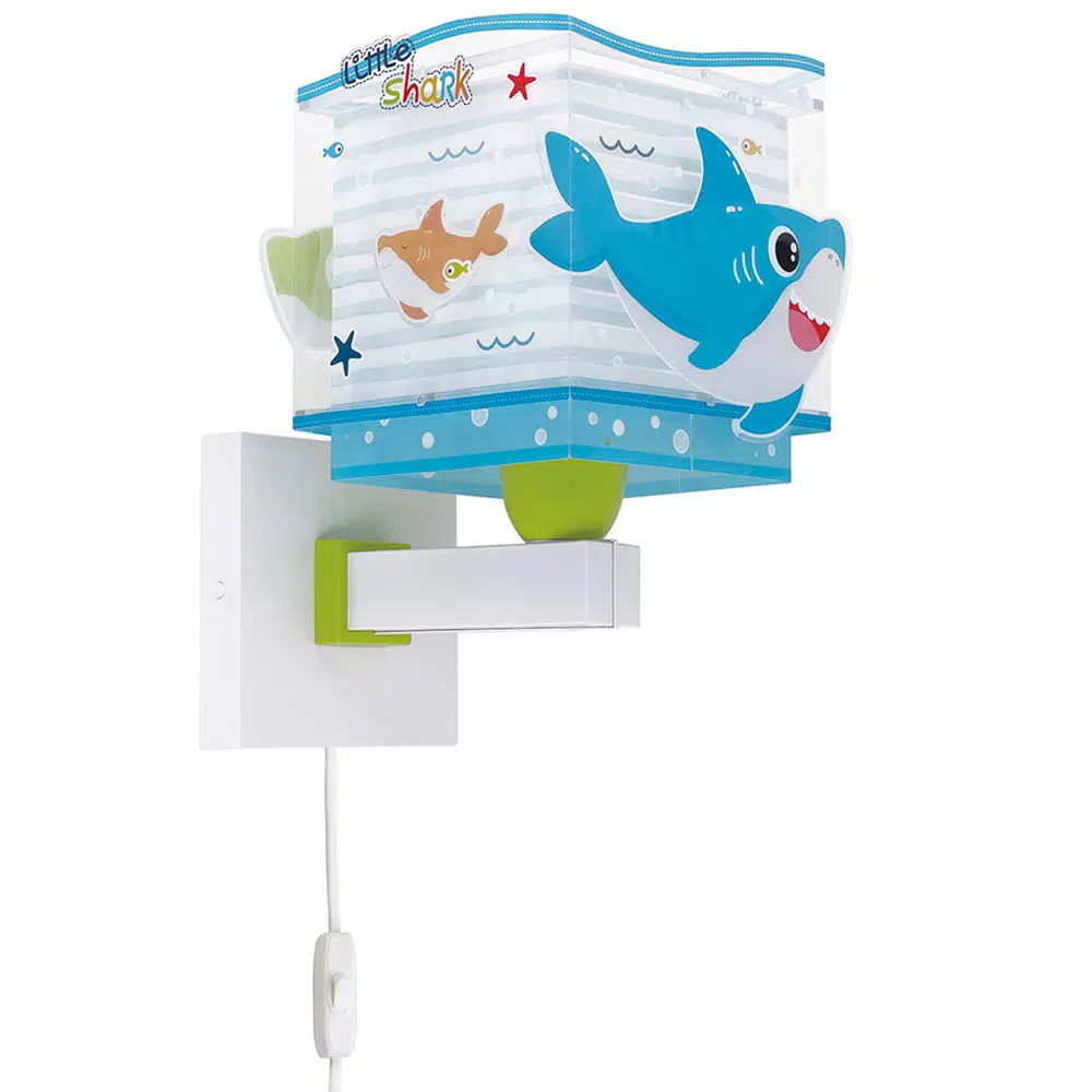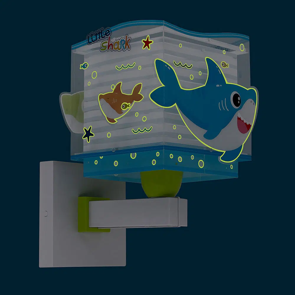 Απλίκα τοίχου με θέμα τους καρχαρίες, ιδανικά σχεδιασμένη για γενικό ή συμπληρωματικό φωτισμό. Φωτίζει και προσθέτει διασκεδαστικό χαρακτήρα και χαρούμενο άγγιγμα σε κάθε παιδικό δωμάτιο ακόμα και στο σκοτάδι με τα εξωτερικά φωσφορίζοντα μέρη του. Η Little Shark απλίκα τοίχου είναι κατάλληλη ακόμα και για διάβασμα πάνω από το προσκέφαλο του κρεβατιού. Παρέχει ομοιόμορφο φως δημιουργώντας περιβάλλον που ενθαρρύνει τα παιδιά να επιδοθούν σε ότι τους αρέσει περισσότερο, διασκεδάζοντας ή δημιουργώντας! Η Little Shark απλίκα τοίχου συμπληρώνει τα υπόλοιπα παιδικά φωτιστικά της συλλογής και είναι κατασκευασμένο εξ ολοκλήρου στην Ευρώπη.