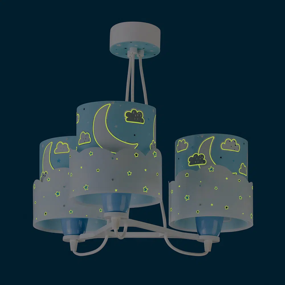 Μοντέρνα, τριγωνική κατασκευή με τρία φωτεινά σώματα σε κάθε γωνία και ανάλογες θέσεις λαμπτήρων. Το Moon Blue κρεμαστό τρίφωτο οροφής είναι κατασκευασμένο με διπλά τοιχώματα προσφέρει άπλετο φως, διασκεδαστικό χαρακτήρα και χρώμα σε κάθε σημείο του παιδικού δωματίου. Το εξωτερικό τοίχωμα των φωτιστικών σωμάτων έχουν φωσφορίζοντα στο σκοτάδι μέρη. Απόλυτα ασφαλές ώστε τα παιδιά να μπορούν να μελετήσουν, να παίξουν και να κοιμηθούν παρέα με το αγαπημένο τους θέμα. Κατασκευάζεται εξ ολοκλήρου στην Ευρώπη και συμπληρώνει τα υπόλοιπα παιδικά φωτιστικά της συλλογής.