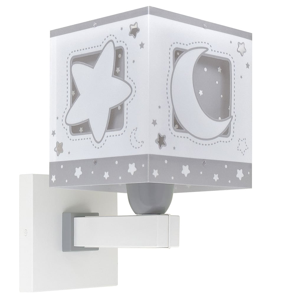 Η Moonlight Gray απλίκα τοίχου με θέμα από τον ουράνιο κόσμο των αστεριών και του φεγγαριού είναι ιδανικά σχεδιασμένη για γενικό ή συμπληρωματικό φωτισμό. Φωτίζει και προσθέτει διασκεδαστικό χαρακτήρα και χαρούμενο άγγιγμα σε κάθε παιδικό δωμάτιο ακόμα και στο σκοτάδι με τα εξωτερικά φωσφορίζοντα μέρη του. Η Moonlight Gray απλίκα τοίχου τοποθετείται στον τοίχο και είναι κατάλληλη ακόμα και για διάβασμα πάνω από το προσκέφαλο του κρεβατιού. Παρέχει ομοιόμορφο φως δημιουργώντας περιβάλλον που ενθαρρύνει τα παιδιά να επιδοθούν σε ότι τους αρέσει περισσότερο, διασκεδάζοντας ή δημιουργώντας! Η Moonlight Gray απλίκα τοίχου είναι διπλού τοιχώματος και συμπληρώνει τα υπόλοιπα παιδικά φωτιστικά της συλλογής. Είναι κατασκευασμένη εξ ολοκλήρου στην Ευρώπη με πιστοποιητικά ασφαλείας.