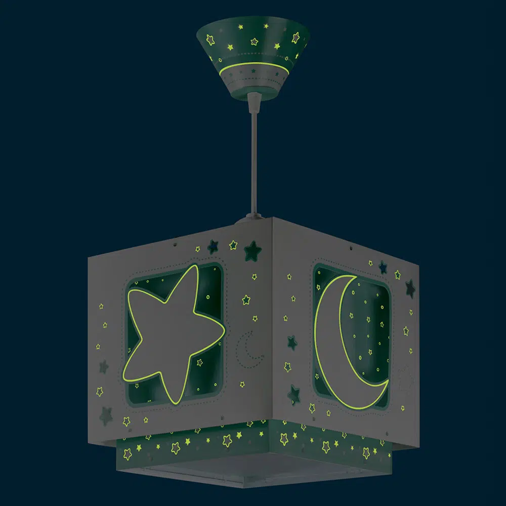 Προσφέρετε στο παιδί σας ένα δωμάτιο γεμάτο μαγεία με το MoonLight Green, ένα παιδικό φωτιστικό οροφής με θέμα τα άστρα και το φεγγάρι, ιδανικό για γενικό φωτισμό. Διαθέτει διπλό τοίχωμα με διάφανη εξωτερική επιφάνεια και φωσφορίζοντα στοιχεία που λάμπουν στο σκοτάδι. Είναι κατασκευασμένο από ανθεκτικό συνθετικό υλικό λεπτού πολυπροπυλενίου με ανεξίτηλες εκτυπώσεις. Το MoonLight Green παιδικό φωτιστικό περιλαμβάνει διαχυτή φωτός που προσφέρει ομοιόμορφο φωτισμό και προστατεύει τα μάτια, ιδανικό για μικρές ηλικίες. Το σετ ανάρτησης είναι πλήρες, με ρυθμιζόμενο καλώδιο ύψους, κλέμα, γάντζο και ροζέτα για την κάλυψη των σημείων σύνδεσης και στήριξης. Το MoonLight Green παιδικό φωτιστικό απαιτεί συναρμολόγηση, τοποθετείτε εύκολα και παράγεται εξ ολοκλήρου στην Ευρώπη.