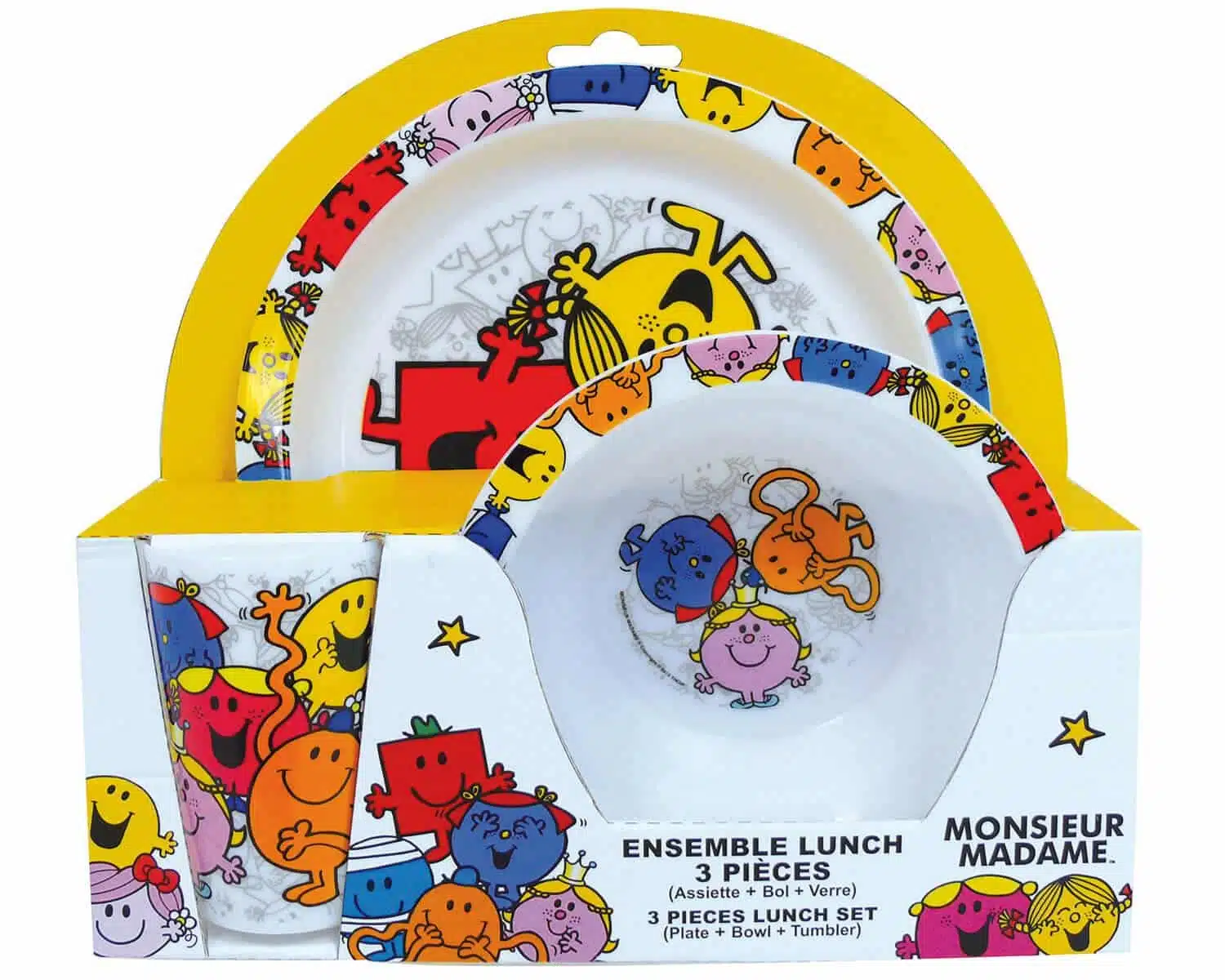 Πρόκειται για σερβίτσιο τριών τεμαχίων με θέμα τους Mr. Men Little Miss το οποίο κάνει διασκεδαστικό κάθε γεύμα των παιδιών σας! Το Mr. Men Little Miss παιδικό σερβίτσιο φαγητού περιλαμβάνει πιάτο, μπολ και ποτήρι. Είναι κατασκευασμένο από πολυπροπυλένιο, κατάλληλο για παιδιά ηλικίας άνω των 6 μηνών.