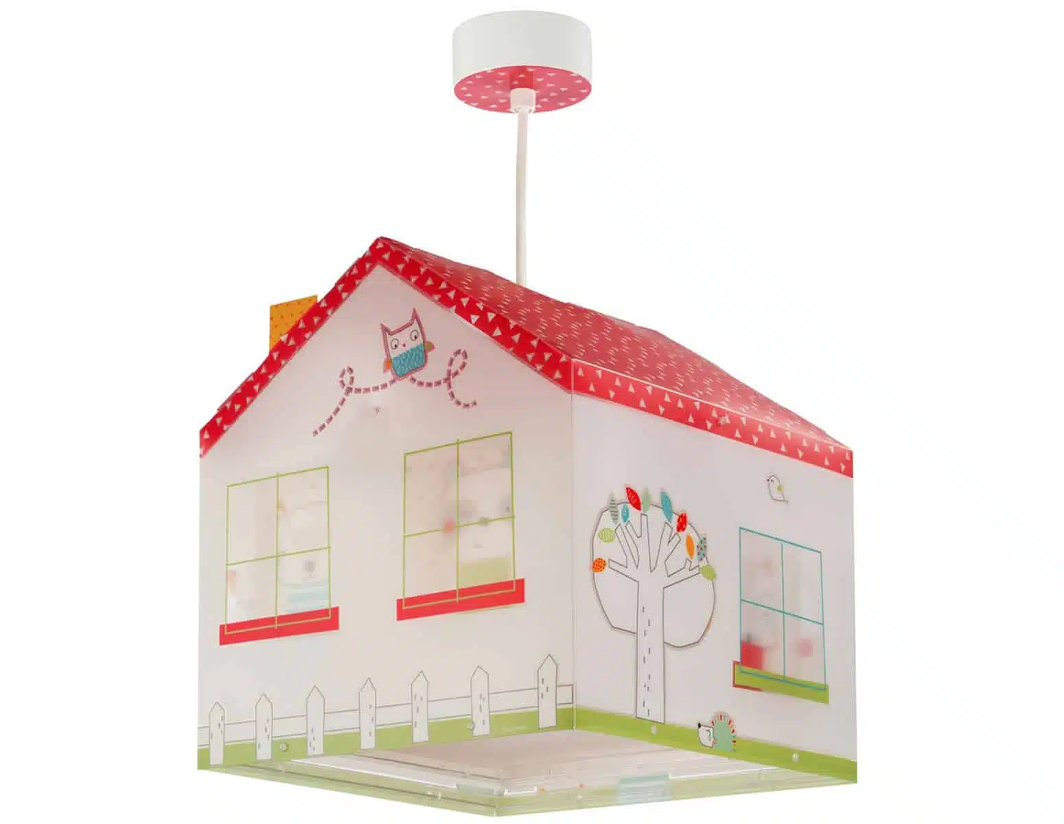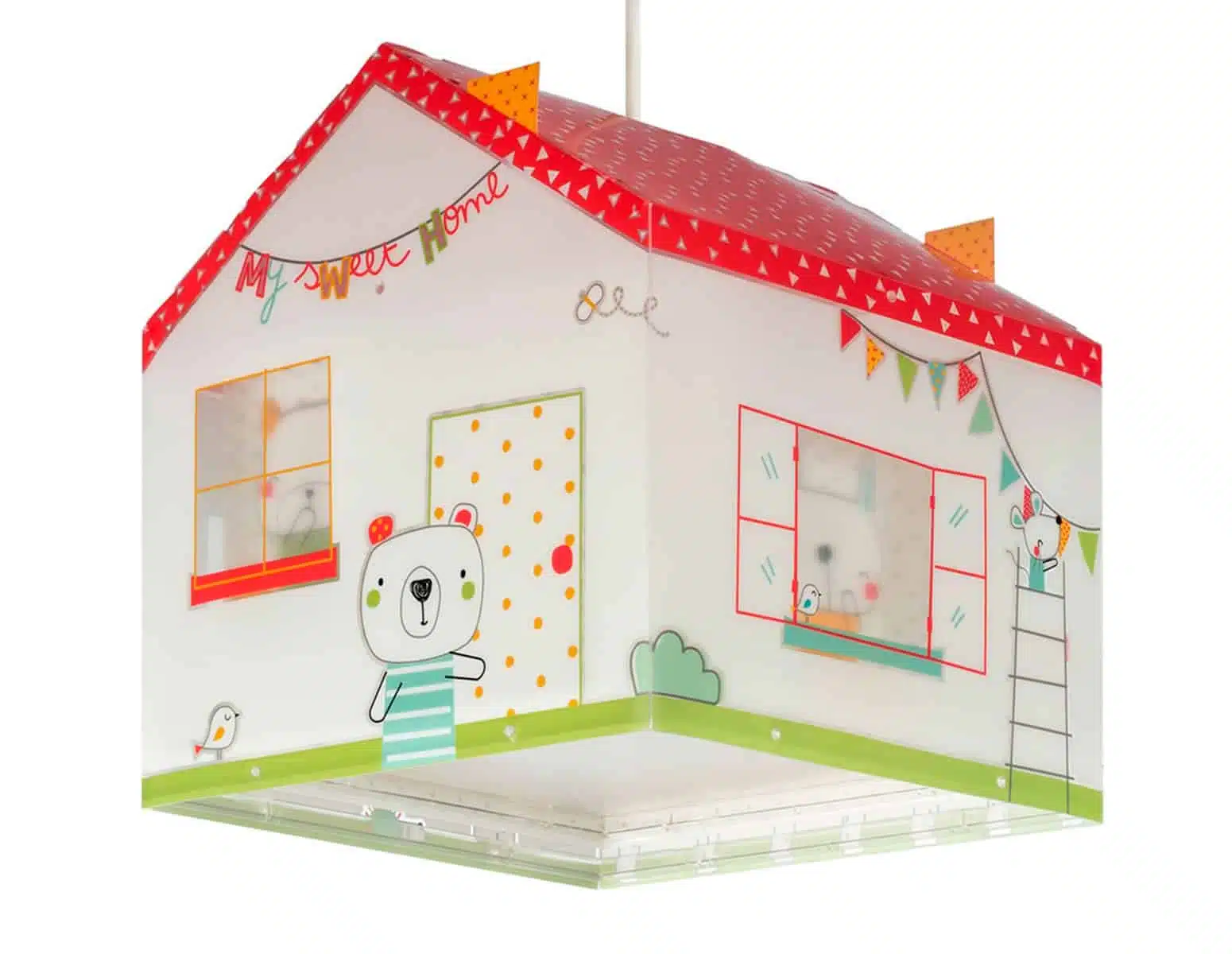Παιδικό φωτιστικό οροφής σε σχήμα σπιτιού κατάλληλο για γενικό φωτισμό. τΟ My Sweet Home κρεμαστό παιδικό φωτιστικό οροφής είναι διπλού τοιχώματος με διάφανο εξωτερικό τοίχωμα. Συνθετικό υλικό αντοχής πολυπροπυλενίου, διάφανα μέρη στήριξης για φωτισμό χωρίς σκιές. Κιτ ανάρτησης με διακοσμημένη ροζέτα ρυθμιζόμενο στο ύψος. Παρέχεται διαχυτής φωτός για ομοιόμορφο φωτισμό. Τύπος ντουί E27 με θέση για έναν λαμπτήρα Led ή οικονομίας. Διαστάσεις σε εκατοστά: Μ:24, Π:24, Υ:25,5. Κατασκευασμένο εξ ολοκλήρου στην Ευρώπη. Το My Sweet Home κρεμαστό παιδικό φωτιστικό οροφής συμπληρώνει τα υπόλοιπα παιδικά φωτιστικά της συλλογής.