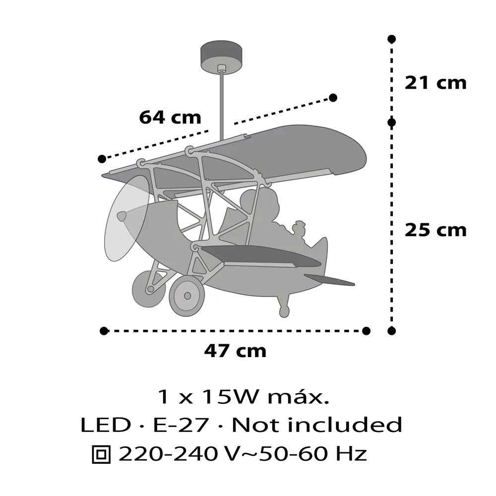 Ένα παιδικό φωτιστικό κρεμαστό οροφής, μεγάλο σε μέγεθος, με θέμα τον αγαπημένο των παιδιών Snoopy κατάλληλο για γενικό φωτισμό. Το φωτιστικό δίνει την εντύπωση μιας απογειώσεως, προσφέροντας άφθονο φως, χαρά και ενθουσιασμό στα παιδιά. Το Snoopy airplane κρεμαστό φωτιστικό οροφής είναι κατασκευασμένο με ξύλινο σώμα (MDF) και διάφανα φτερά από άκαυστο πολυπροπυλένιο. Η μαγεία διαρκεί ακόμη και στο σκοτάδι, καθώς το φωτιστικό φωσφορίζει για περίπου 15-20 λεπτά, μέχρι το παιδί να κοιμηθεί. Το κιτ ανάρτησης στο Snoopy airplane κρεμαστό φωτιστικό οροφής είναι πλήρες και περιέχει σετ γάντζου, καλώδιο ρυθμιζόμενο στο ύψος καθώς και ροζέτα κάλυψης σημείων σύνδεσης & στήριξης. Τοποθετείται εύκολα και είναι κατασκευασμένο εξ ολοκλήρου στην Ευρώπη.