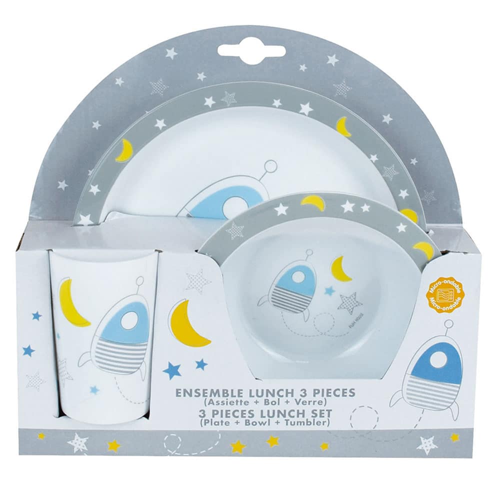 Πρόκειται για σερβίτσιο τριών τεμαχίων με θέμα το διάστημα Space το οποίο κάνει διασκεδαστικό κάθε γεύμα των παιδιών σας ! Το Space παιδικό σερβίτσιο φαγητού περιλαμβάνει πιάτο, μπολ και ποτήρι. Είναι κατασκευασμένο από πολυπροπυλένιο, κατάλληλο για παιδιά ηλικίας άνω των 6 μηνών.