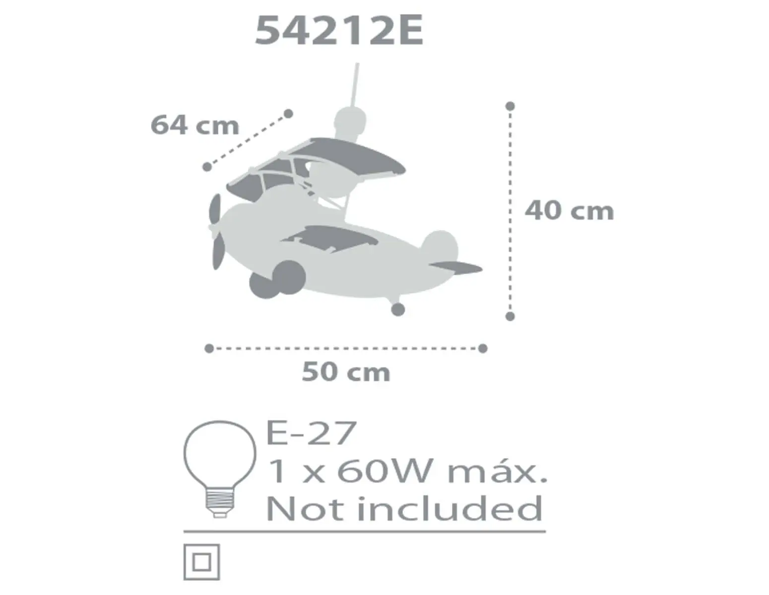 Παιδικό φωτιστικό οροφής κατάλληλο για γενικό φωτισμό σε σχήμα αεροπλάνου. Συνθετικό υλικό αντοχής από πολυπροπυλένιο, συνθετικά, πλαστικά μέρη και hardboard. Σώμα από hardboard σε λεπτό πάχος, που δεν περιορίζει τη φωτεινότητα. Απαιτείτε συναρμολόγηση από ενήλικα. Τροφοδοσία ρεύματος:220V-240V. Τύπος ντουί E27 με θέση για ένα μεγάλο τύπου λαμπτήρα. Διαστάσεις σε εκατοστά: Μ:64 x Π:50 x Υ:40. Το Stars Gray σχήμα αεροπλάνο φωτιστικό οροφής κατασκευάζετε εξ ολοκλήρου στην Ευρώπη και ταιριάζει σε όλα τα παιδικά δωμάτια.