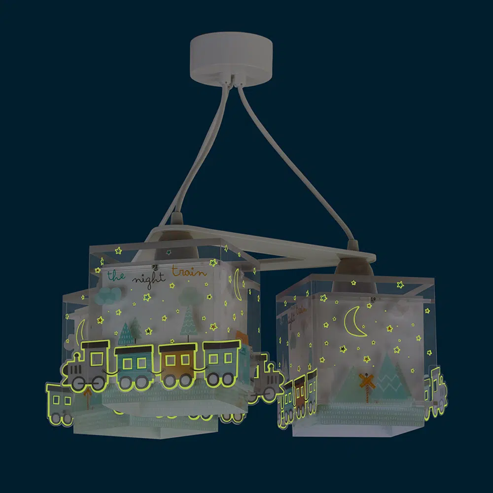 Μοντέρνα, τριγωνική κατασκευή με τρία φωτεινά σώματα σε κάθε γωνία και ανάλογες θέσεις λαμπτήρων. Το The Night Train κρεμαστό τρίφωτο οροφής είναι κατασκευασμένο με διπλά τοιχώματα και προσφέρει άπλετο φως, διασκεδαστικό χαρακτήρα και χρώμα σε κάθε σημείο του παιδικού δωματίου. Το εξωτερικό τοίχωμα των φωτιστικών σωμάτων έχουν φωσφορίζοντα στο σκοτάδι μέρη. Απόλυτα ασφαλές ώστε τα παιδιά να μπορούν να μελετήσουν, να παίξουν και να κοιμηθούν παρέα με το αγαπημένο τους θέμα. Το The Night Train κρεμαστό τρίφωτο οροφής κατασκευάζεται εξ ολοκλήρου στην Ευρώπη και συμπληρώνει τα υπόλοιπα φωτιστικά της συλλογής.