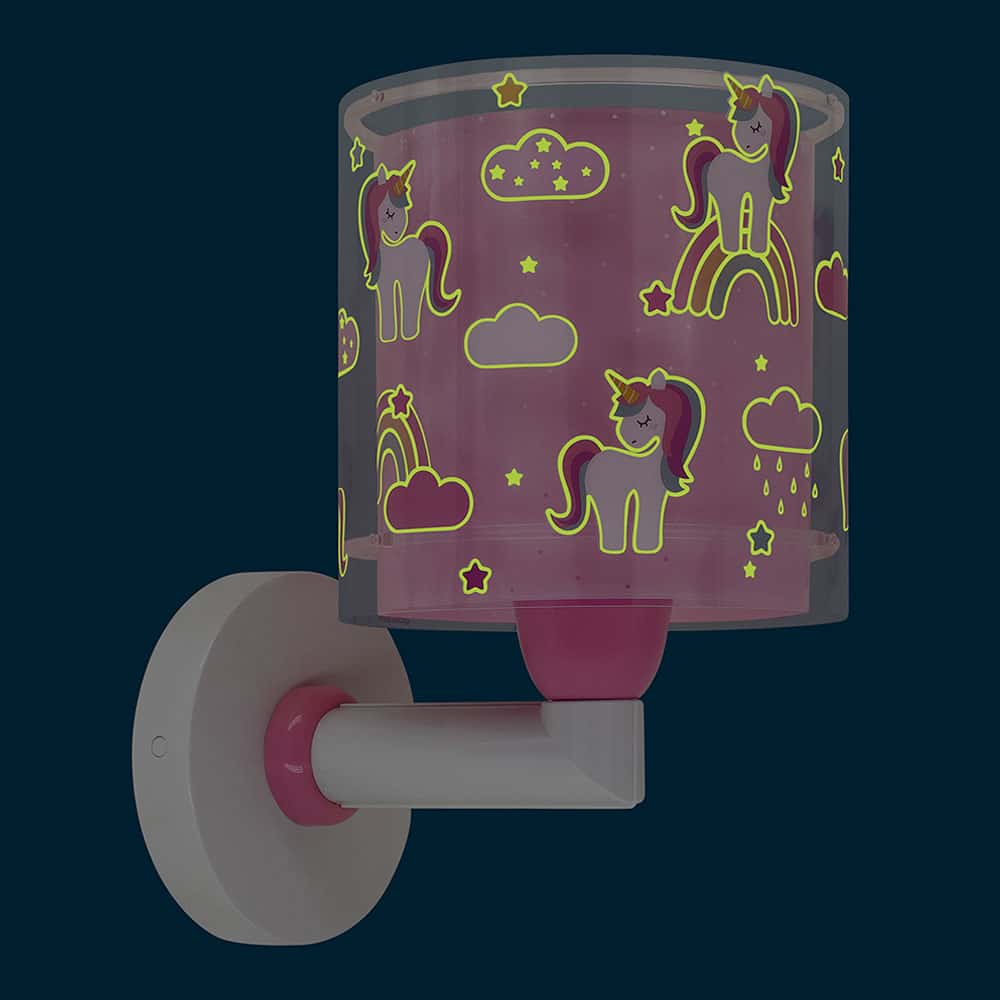Απλίκα τοίχου με θέμα τον μονόκερο, ιδανικά σχεδιασμένη για γενικό ή συμπληρωματικό φωτισμό. Φωτίζει και προσθέτει διασκεδαστικό χαρακτήρα και χαρούμενο άγγιγμα σε κάθε παιδικό δωμάτιο ακόμα και στο σκοτάδι με τα εξωτερικά φωσφορίζοντα μέρη του. Η Unicorns απλίκα τοίχου διπλού τοιχώματος είναι κατάλληλη ακόμα και για διάβασμα πάνω από το προσκέφαλο του κρεβατιού. Παρέχει ομοιόμορφο φως δημιουργώντας περιβάλλον που ενθαρρύνει τα παιδιά να επιδοθούν σε ότι τους αρέσει περισσότερο, διασκεδάζοντας ή δημιουργώντας! Η Unicorns απλίκα τοίχου διπλού τοιχώματος συμπληρώνει τα υπόλοιπα παιδικά φωτιστικά της συλλογής και είναι κατασκευασμένη εξ ολοκλήρου στην Ευρώπη.